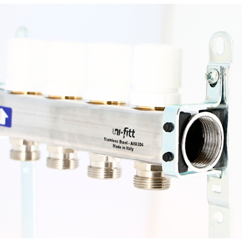 Коллекторные группы Uni-Fitt предназначены для распределения и регулирования потоков теплоносителя в низко- или высокотемпературных системах отопления. Оснащены балансировочными вентилями на подающем коллекторе и термостатическими вентилями (с возможностью установки термоэлектрических приводов) на обратном коллекторе.
