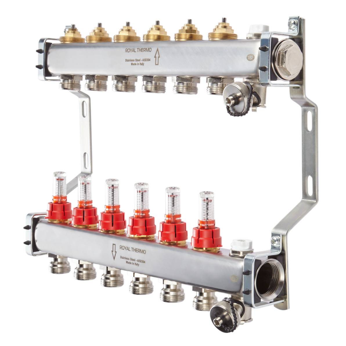 Применяются в качестве распределителя теплоносителя в контуры теплого пола. Для удобства балансировки системы напольного отопления на коллектор установлены расходомеры для визуального контроля и необходимой регулировки расхода теплоносителя в отдельных контурах теплого пола.