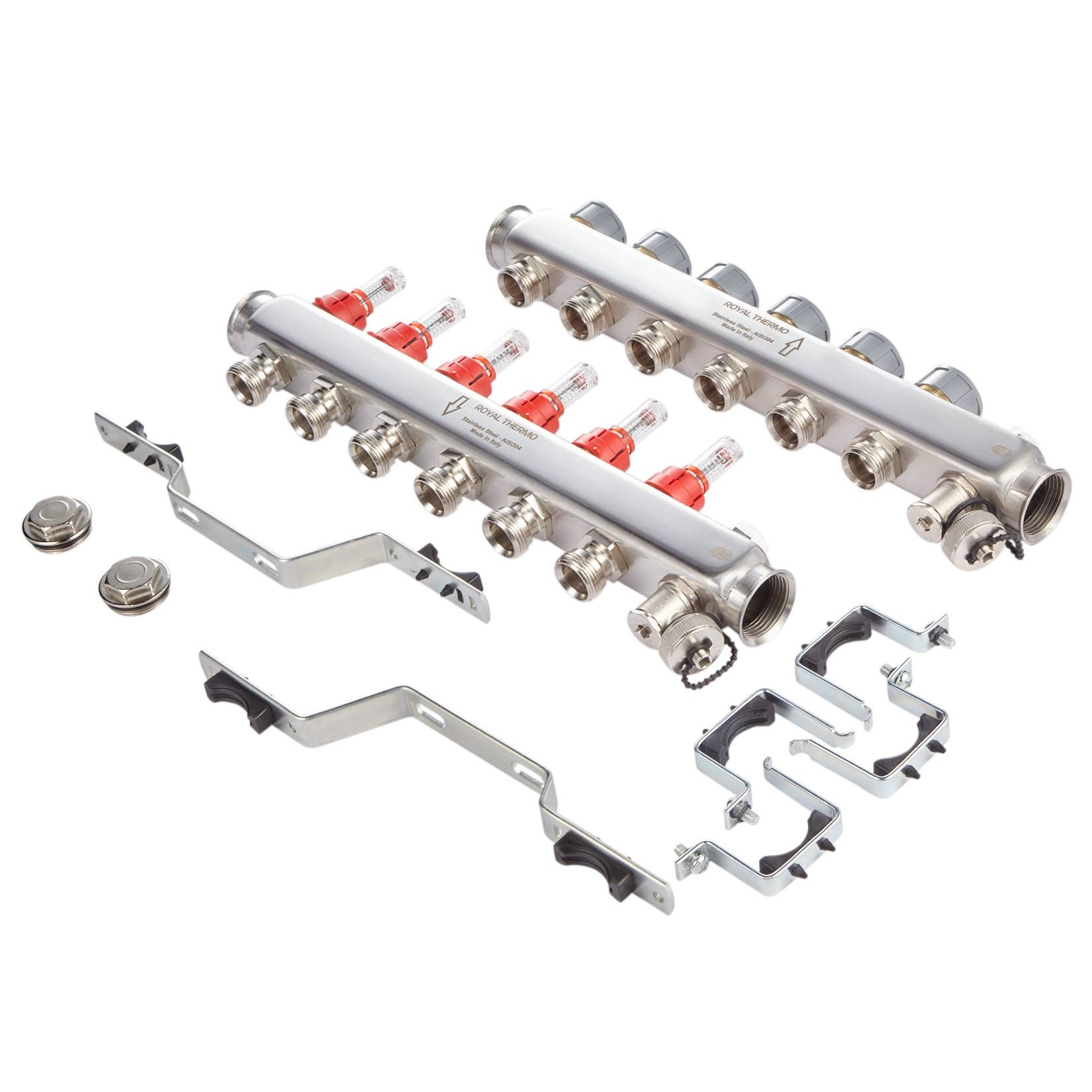 Применяются в качестве распределителя теплоносителя в контуры теплого пола. Для удобства балансировки системы напольного отопления на коллектор установлены расходомеры для визуального контроля и необходимой регулировки расхода теплоносителя в отдельных контурах теплого пола.