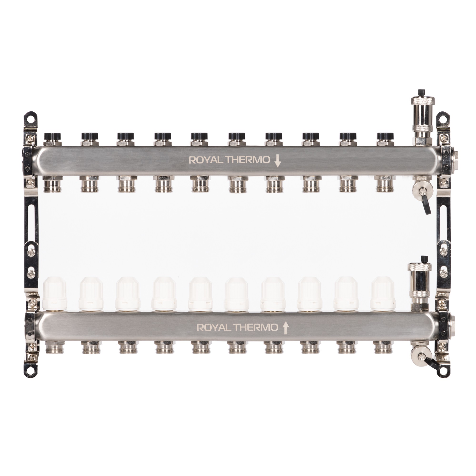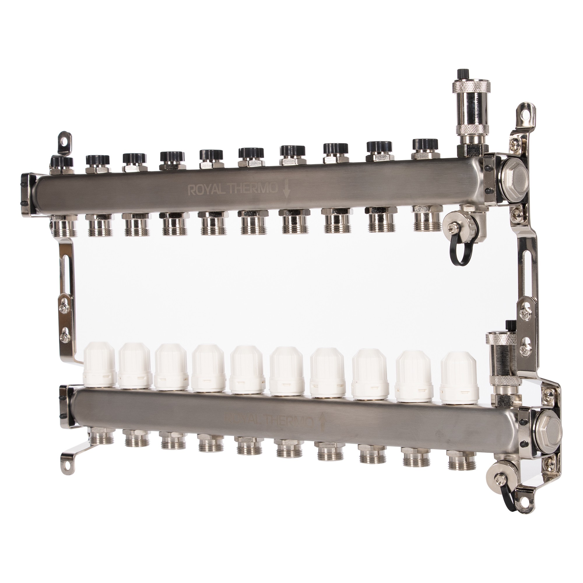 Универсальный коллектор из нержавеющей стали Royal Thermo предназначен для распределения теплоносителя в системах отопления и водяного теплого пола.