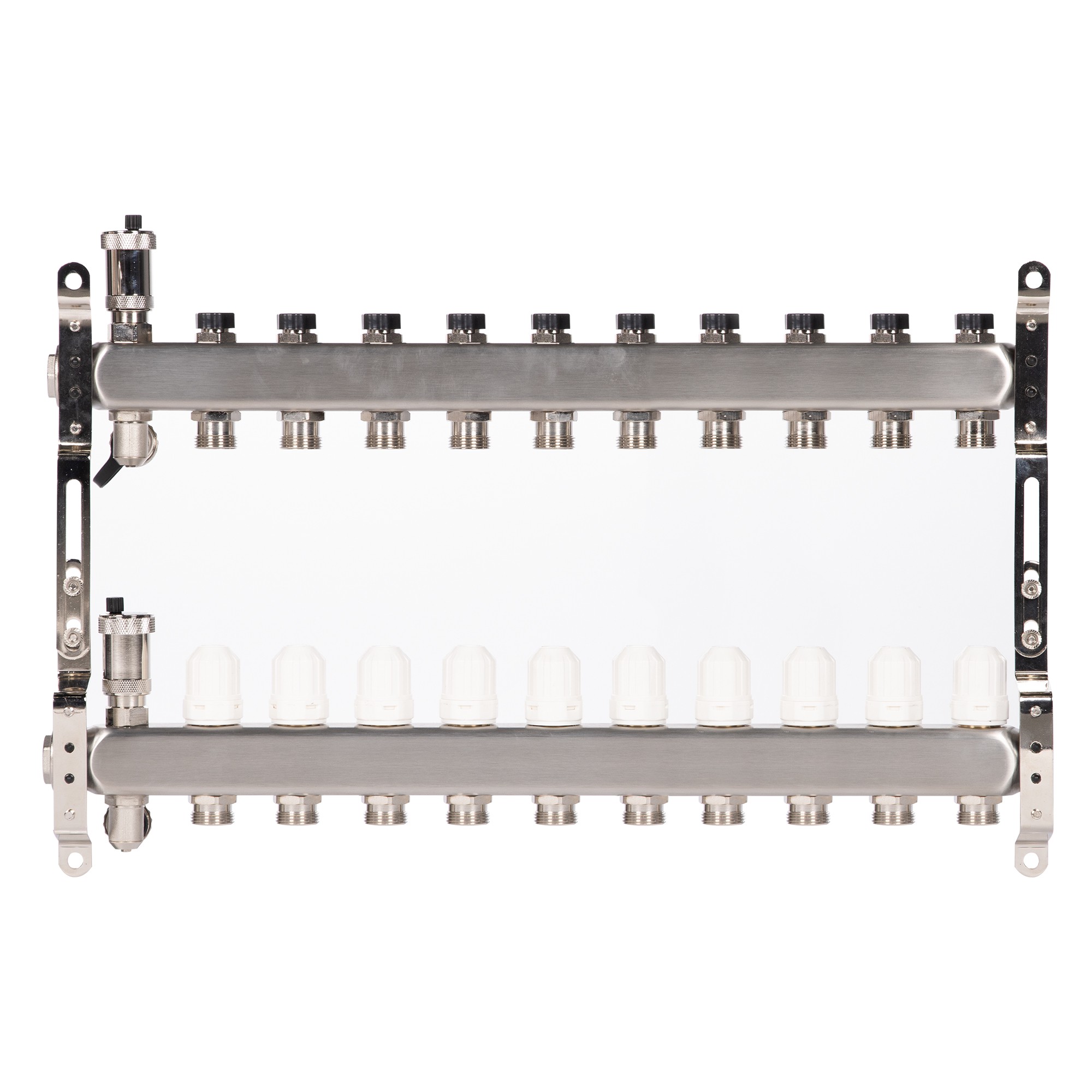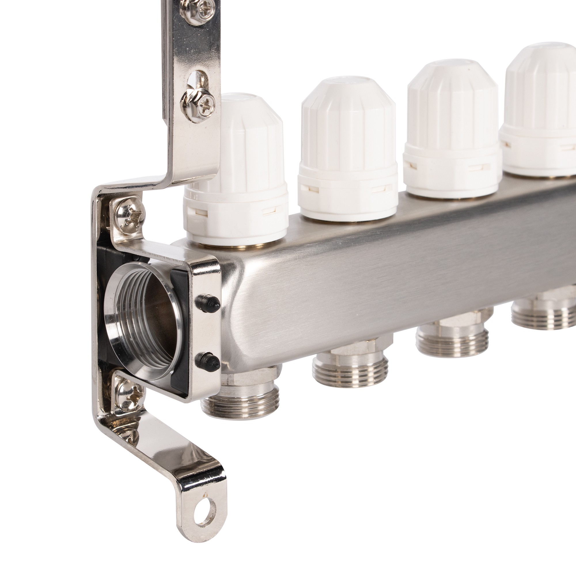 Благодаря удобной конструкции – коллектор легко монтировать и обслуживать. А применение высококачественной нержавеющей стали марки AISI 304 для производства коллектора позволяет защитить прибор от воздействия коррозии. Наличие нескольких выходов дает возможность подключить сразу несколько контуров.