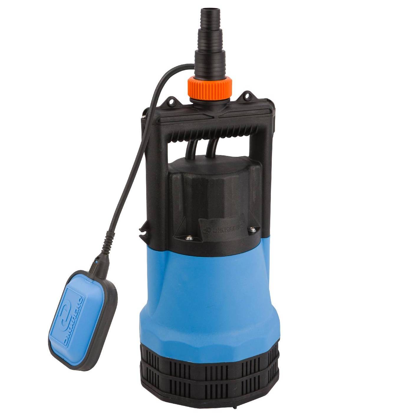 Центральное выходное отверстие в ручке — уменьшает общие габариты при присоединении магистрали, накидная гайка — позволяет быстро и комфортно смонтировать/демонтировать насос, не нарушая целостности отводящей магистрали, оранжевый цвет облегчает поиск в траве или земле при проведении работ.