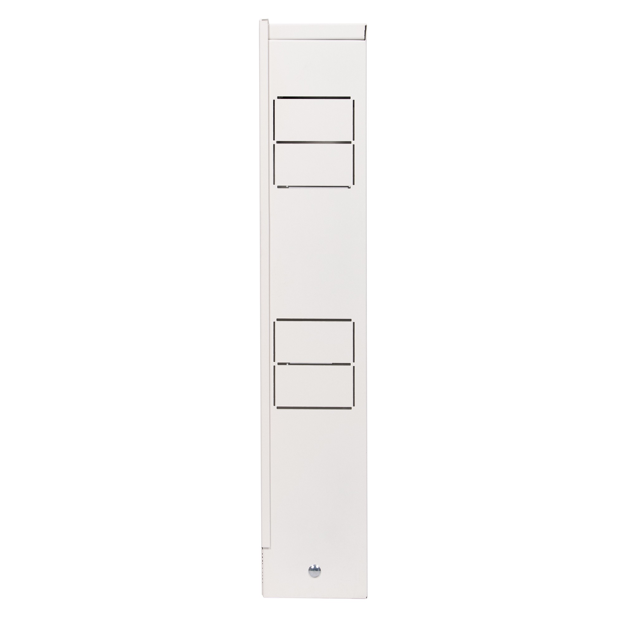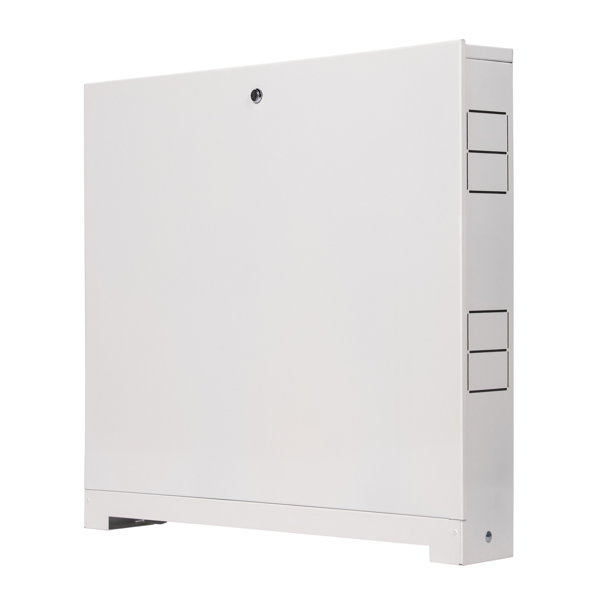 Шкаф изготовлен из цельного стального листа. Технология изготовления без применения сварки. Применяется для монтажа в системах отопления и водоснабжения. Шкаф выполнен из стали, окрашен порошковой краской RAL 9016 с предварительным нанесением фосфатной пленки для придания антикоррозионных свойств изделию. В боковых стенках корпуса шкафа выполнена перфорация, сегменты которой удаляются в любом удобном месте для подсоединения трубопроводов.