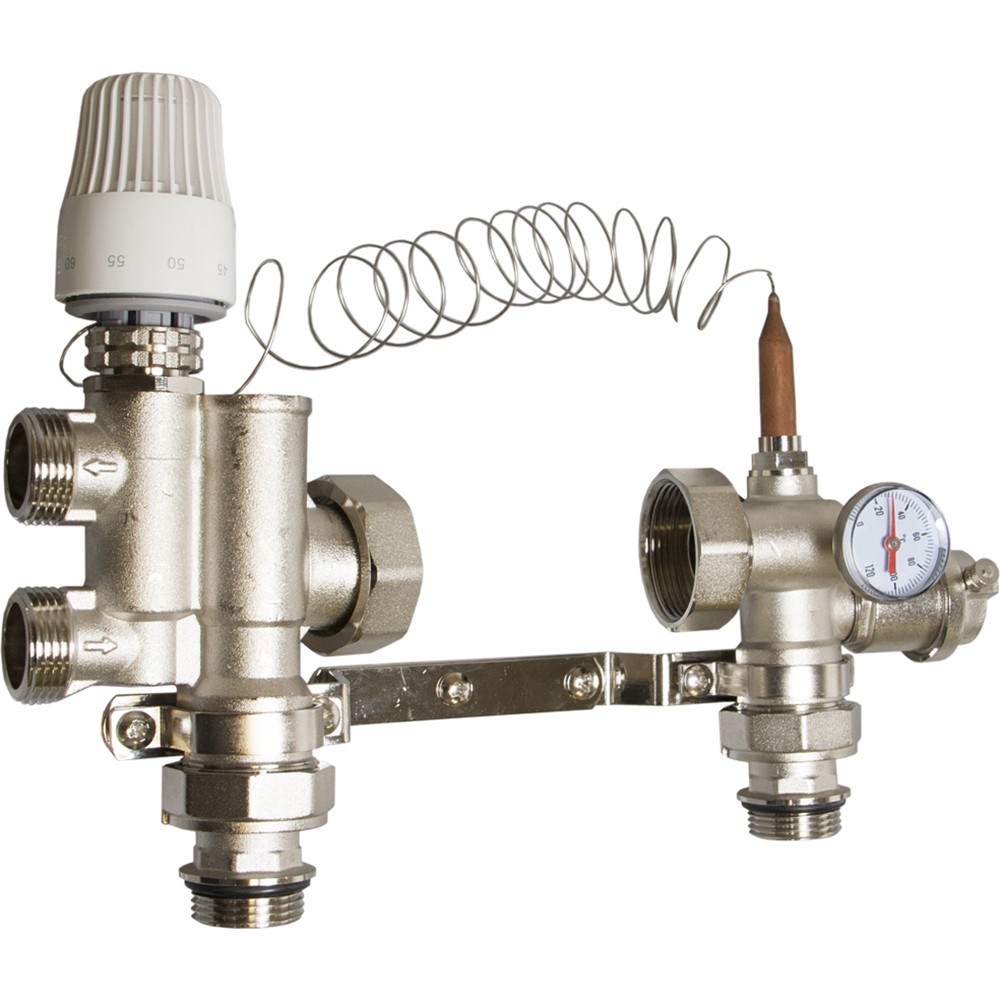 Монтируется на коллекторной группе низко-температурного контура, подключается к высокотемпературному контуру системы отопления.