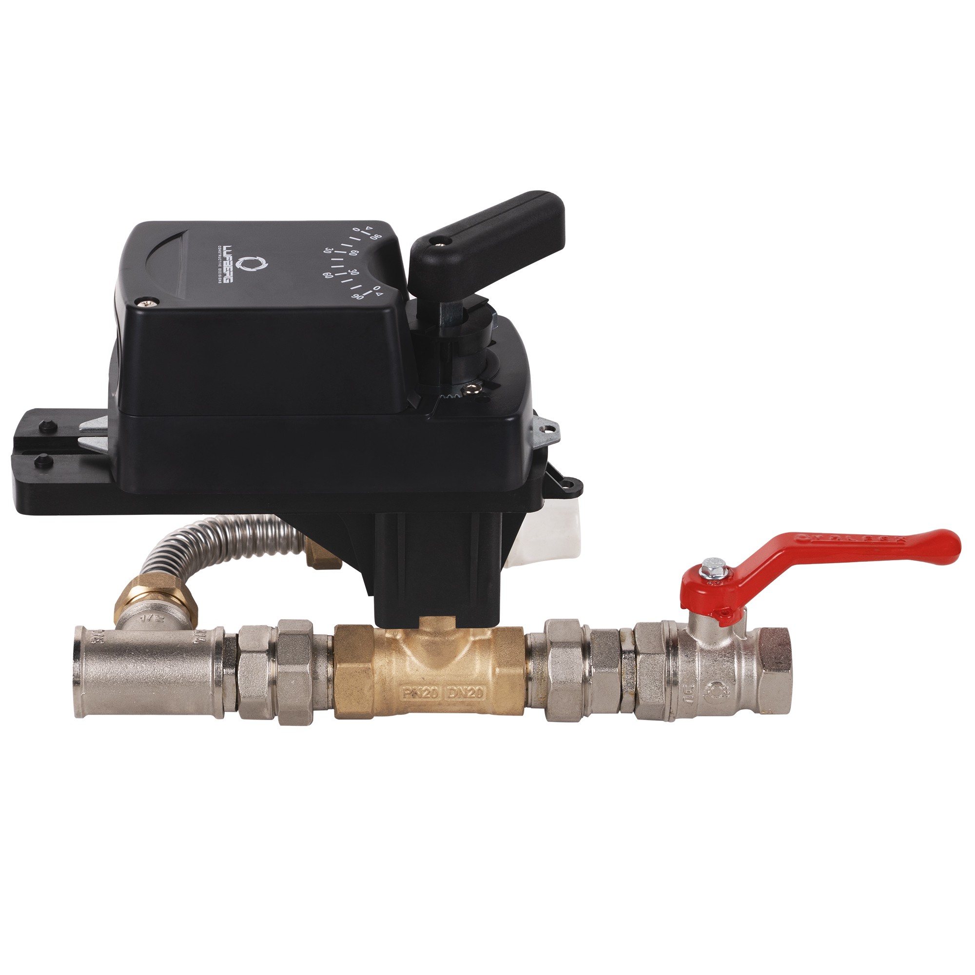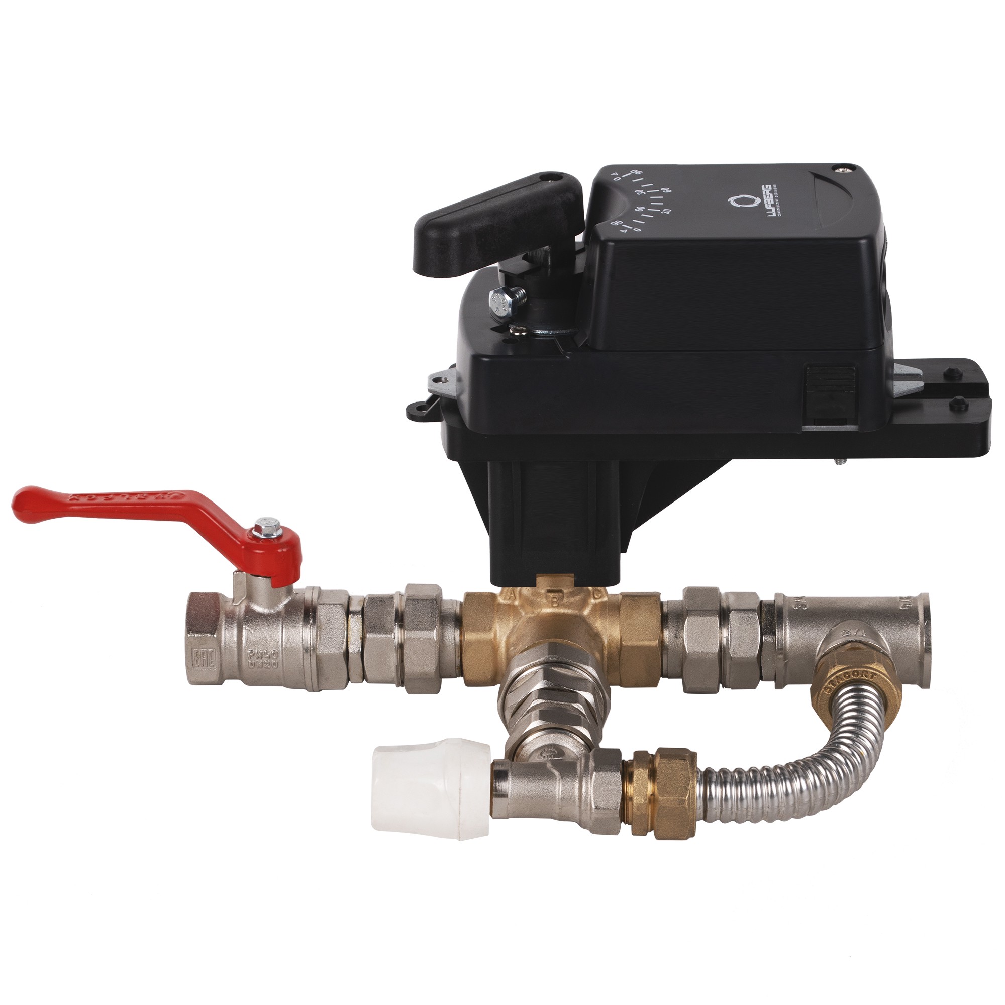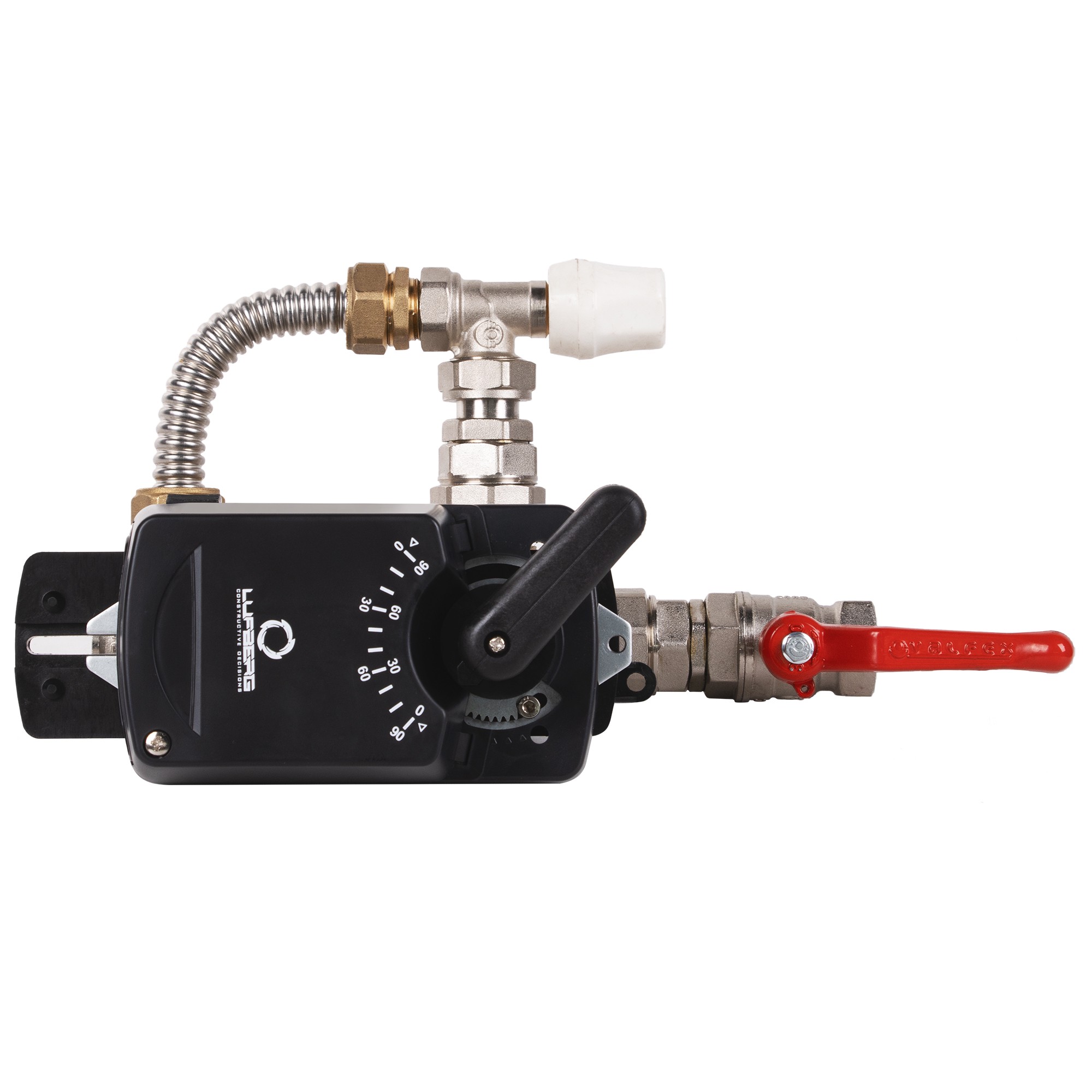 Смесительный узел для подключения воздушных завес с водяным теплообменником к системе отопления. Благодаря встроенному электромагнитному клапану узел в автоматическом режиме контролирует проток теплоносителя через теплообменник завесы тем самым регулирует ее тепловую мощность и температуру помещения.