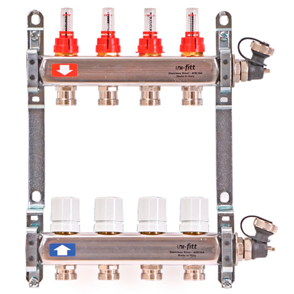 Коллекторные группы Uni-Fitt предназначены для распределения и регулирования потоков теплоносителя в низко- или высокотемпературных системах отопления. Оснащены расходомерами на подающем коллекторе и термостатическими вентилями (с возможностью установки термоэлектрических приводов) на обратном коллекторе. Каждое изделие укомплектовано дренажным клапаном / воздухоотводчиком, который может быть использован для заполнения системы.