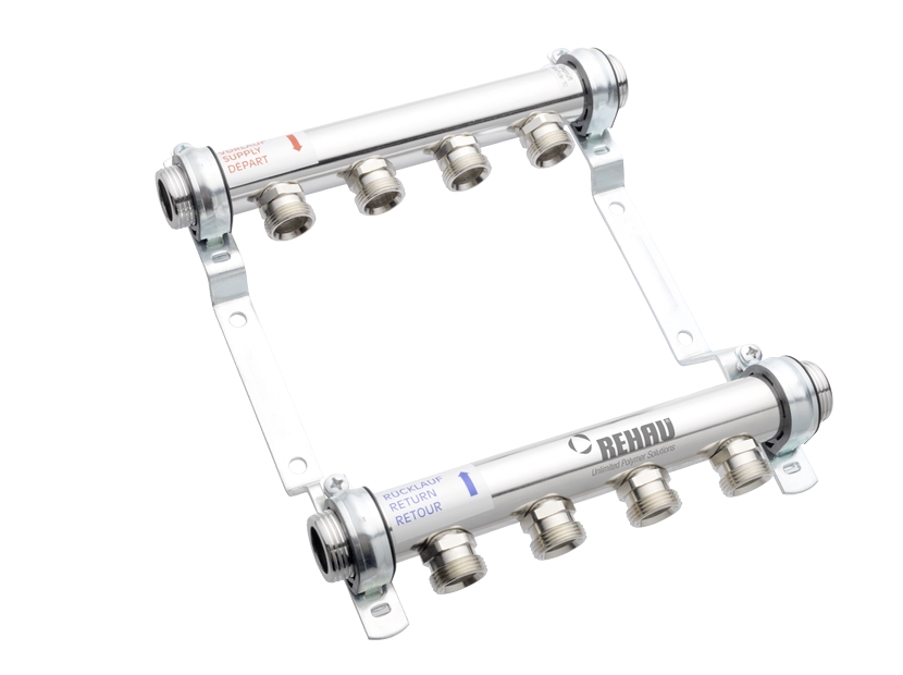 • Комплект поставки: Подающий и обратный коллекторы, с возможностью двухстороннего присоединения с наружной резьбой G1quot; под плоское уплотнение; Никелированные заглушки G1quot; со встроенными воздушными клапанами и уплотнением; Ниппельные отводы под резьбозажимные соединения REHAU Евроконус G3/4quot;; Коллекторы установлены на звукоизолированные оцинкованные кронштейны